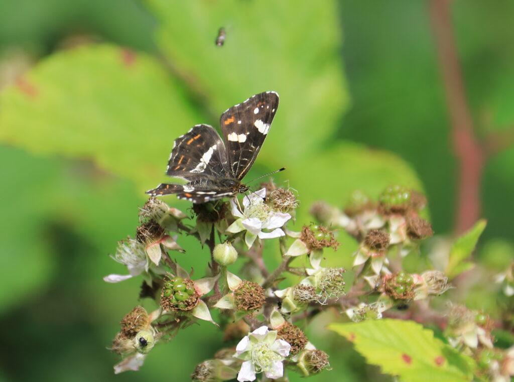 I juli /august flyver sommergenerationen af nældesommerfugl i skovlysninger især de mange brombærkrat trækker den smukke mørkebrune sommerfugl til de lokkende hvide og rosa brombærblomster.