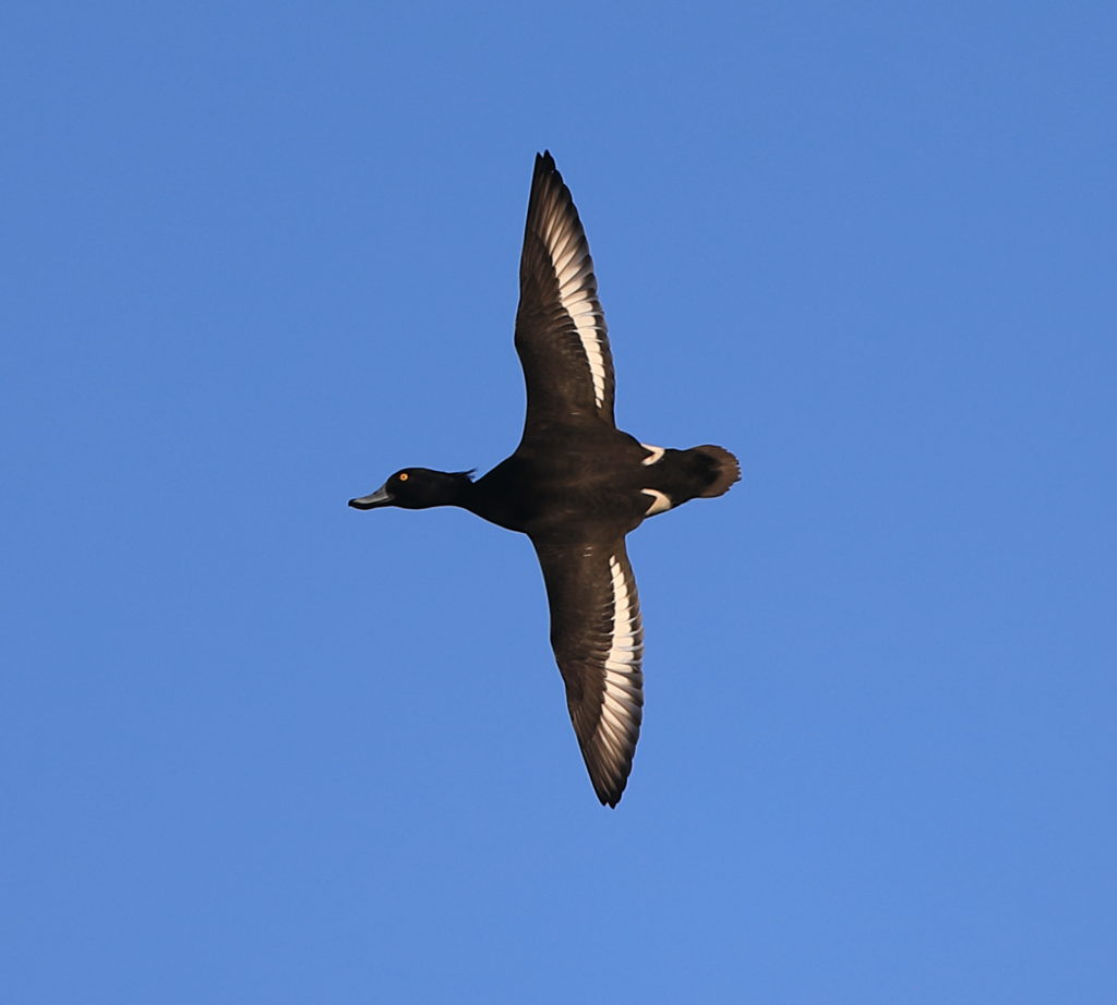Troldanden kender du på det hvide vingespejl den sorte overside og den markante overgang mellem det sorte bryst og den hvide bug, samt hannens karakteristiske top.