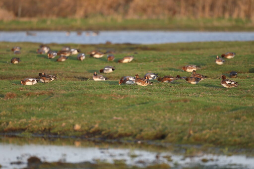 De er kommet i 1000 vis brunnakkerne fra deres ynglepladser i nord. Nu ligger de sammen med svaner, blishøns og knortegæs i ålegræsbælterne i vores fjorde, eller går på de oversvømmede strandenge. Der er pibeænder overalt.