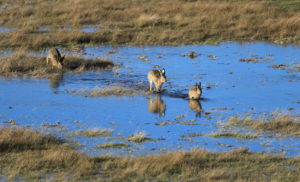 3 harer har fået våde fødder og søger mod tørt dagleje idet engene er kraftigt oversvømmet 24 oktober 2018 © HHE