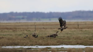 Gl havørn t.v. sammen med de to spraglede ungfugle Nyord 20 november 2018 © HHE