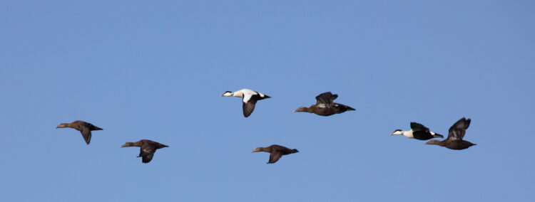 Med lyset kommer fuglene, endeløse rækker af ederfugle flytter sig for at komme til de bedste muslingebanker. Engang imellem får fuglene øje på lokkerne og kommer på stive vinger ind over, mens jægeren dukker sig så vandet er ved at rende ovenind i vaders.